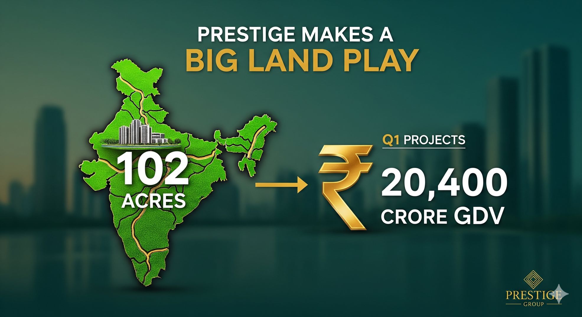 Prestige Estates Projects Ltd has quietly accelerated its land acquisitions, snapping up 102 acres across four major Indian markets in the April–June quarter that the company plans to convert into residential projects with an estimated gross development value (GDV) of about ₹20,400 crore. The move underlines Prestige’s push to replenish pipeline inventory and chase growth in high-demand micro-markets.